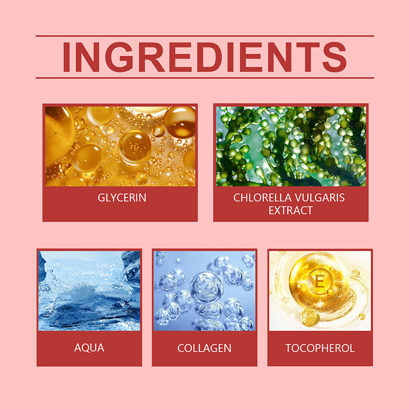 Ingredientes: Agua, glicerina, extracto de clorella, colágeno, vitamina E.