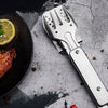 DISEÑO MULTIFUNCIONAL 3 EN 1: Combina las funciones de tenedor, espátula y pinza en una herramienta compacta que se desmonta fácilmente para su uso individual. El innovador mecanismo de pinza sujeta firmemente los alimentos mientras se voltean, sirviendo como herramienta de agarre y utensilio de servicio para una máxima eficiencia de asado.