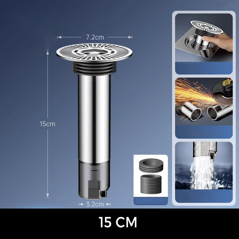 DISEÑO EXTENDIDO: Con longitudes extendidas de 6,5 cm, 11 cm y 15 cm, este desagüe se adapta perfectamente a varios grosores de suelo, proporcionando una solución universal para baños modernos.