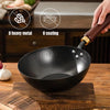 WOK DE HIERRO FORJADO HECHO A MANO - Fabricado con mineral de hierro de alta calidad mediante técnicas tradicionales, este wok se forja a altas temperaturas para eliminar las impurezas. El acabado martillado a mano aumenta su durabilidad, haciéndolo resistente a los arañazos y la corrosión, al tiempo que garantiza que no se filtren metales pesados en los alimentos.