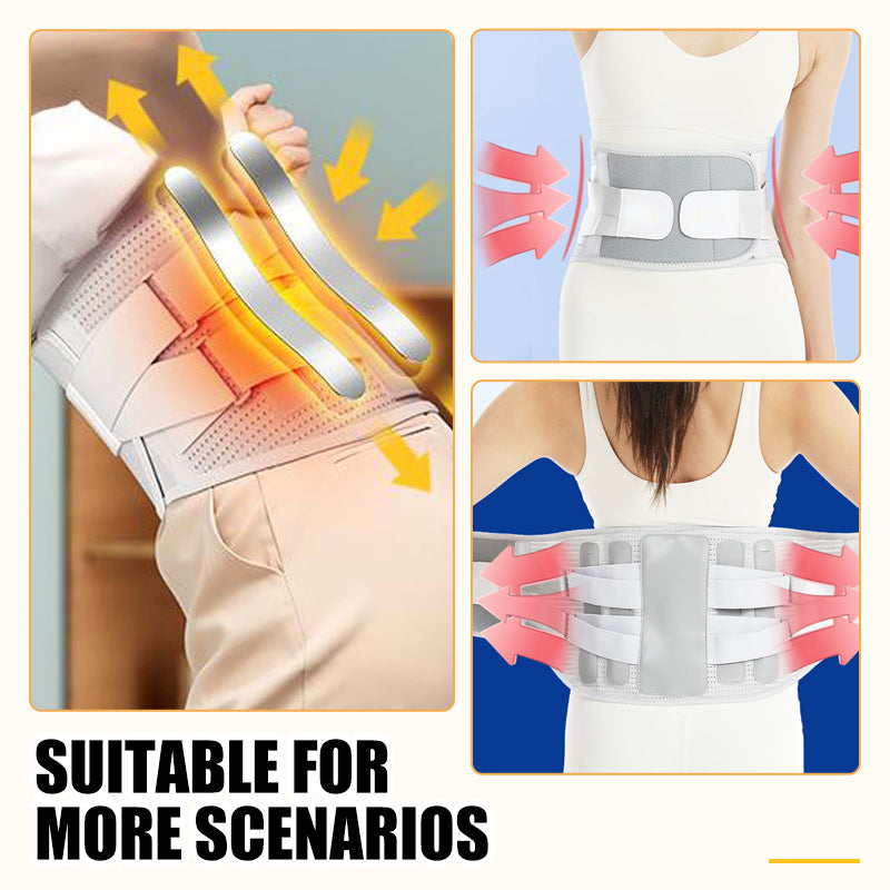 Incluye: 1 cinturón de soporte lumbar + 2 almohadillas térmicas para el abdomen + 4 barras de soporte flexibles de resina + 4 placas curvas de acero con memoria + 1 placa de soporte lumbar biónica.