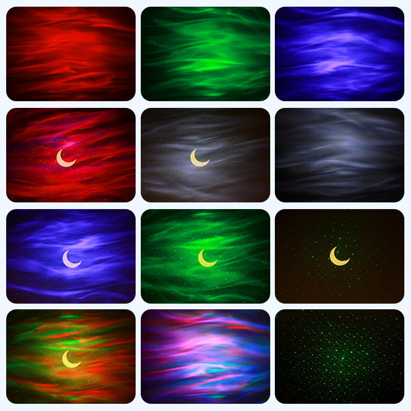 Aurora boreal/Luna y estrellas/Estrellas azules/Estrellas verdes. Una variedad de colores combinados con una proyección dinámica del cielo nocturno a diferentes velocidades, creando una atmósfera relajada, romántica y colorida, para mostrarle un magnífico cielo estrellado.