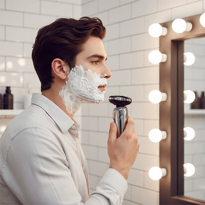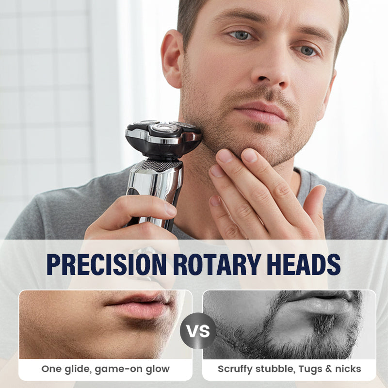 AFEITADO ROTATORIO DE PRECISIÓN - Equipada con tres cabezales giratorios independientes, la afeitadora se adapta automáticamente a los contornos de la cara y el cuello. Este movimiento flexible garantiza un afeitado apurado y uniforme, capturando eficazmente la barba incipiente y proporcionando un acabado suave y limpio en las diferentes curvas faciales sin irritación.